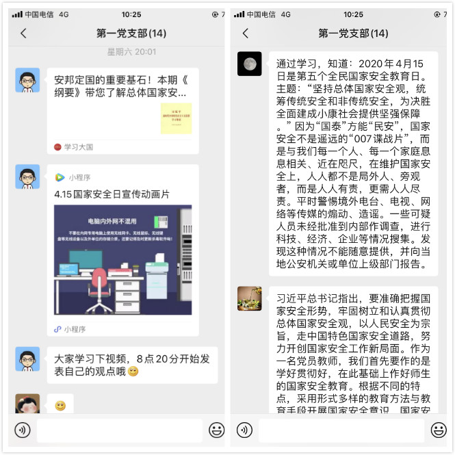 為切實(shí)加強(qiáng)國(guó)家安全意識(shí),4月11日,藥學(xué)系第一黨支部使用微信群在線學(xué)習(xí)國(guó)家安全教育主題學(xué)習(xí)活動(dòng),活動(dòng)由何舒瀾書記支持。