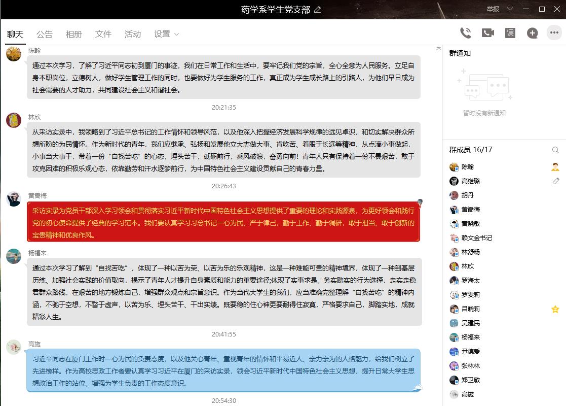 習近平總書記曾在1985年廈門市委常委組織生活會上說,“我來廈門工作,用孫中山先生‘不要立志做大官,而要立志做大事’來勉勵自己,地位變了,作風不能變”。5月16日,藥學系學生黨支部通過QQ平臺,集中學習李秀記采訪錄“習近平同志來廈門是要‘立志做大事’”,支部全體師生黨員參與學習。