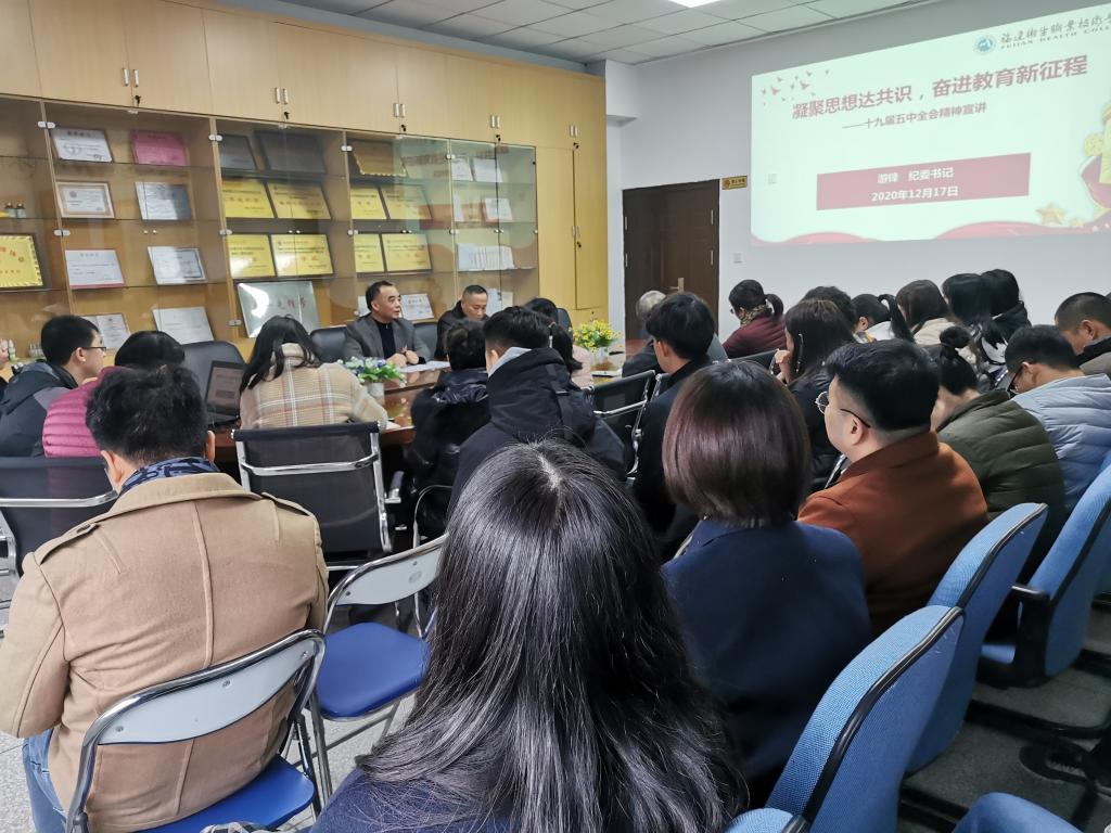課上,游鋒首先回顧了十九屆五中全會會議內(nèi)容,并從“辦學規(guī)模和質(zhì)量不斷攀升、教學改革成效顯著、智慧校園基本成型、推進校內(nèi)外實訓基地建設(shè)”等四個方面詳細闡述了我校教育發(fā)展“十三五”期間取得的顯著成就,最后,立足學校實際,結(jié)合高水平職業(yè)院校建設(shè)十大工程重點解讀了學?!笆奈濉苯ㄔO(shè)發(fā)展計劃。