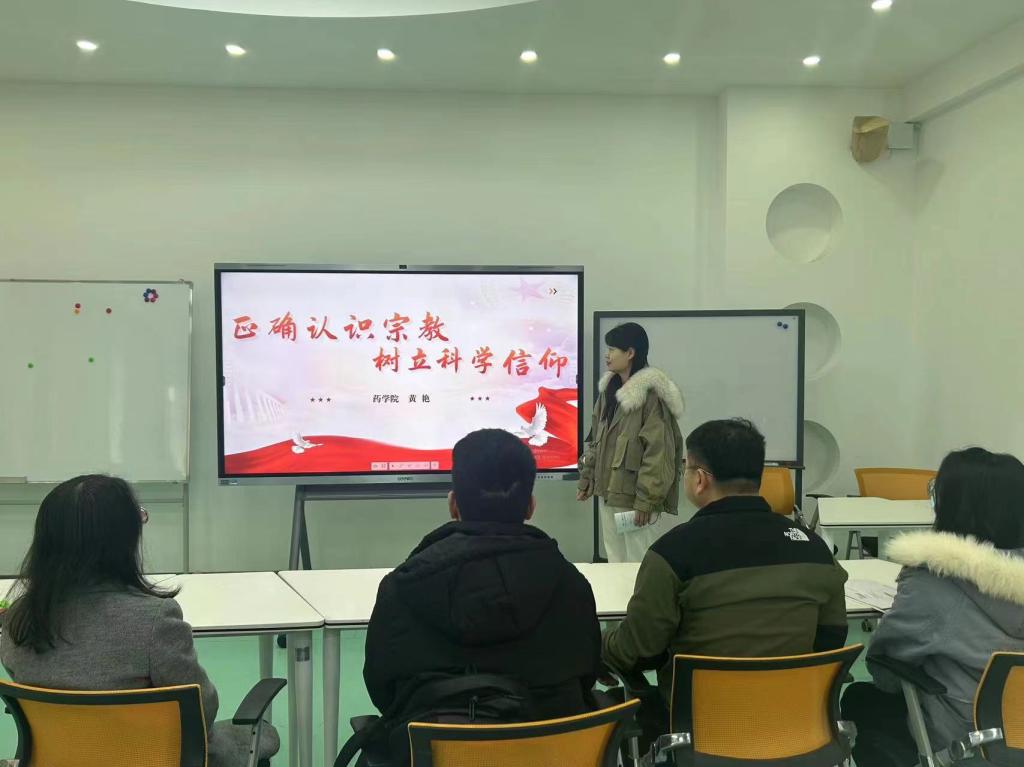 12月19日,藥學(xué)院學(xué)生第二黨支部黨員、藥學(xué)院副院長黃艷為支部黨員主講“正確認(rèn)識宗教 樹立科學(xué)信仰”專題黨課。課上詳細(xì)講解了宗教的性質(zhì)及起源、馬克思主義宗教觀、我國的基本宗教政策等內(nèi)容,最后引出“我們應(yīng)如何正確對待宗教”。黃艷指出,我國是一個多民族國家,宗教更多的是與民族信仰和民族感情聯(lián)系在一起,要尊重一個民族,就要尊重他們的民族信仰。我們當(dāng)代應(yīng)該堅定馬克思主義信仰,認(rèn)真學(xué)習(xí)和運(yùn)用辯證唯物主義和歷史唯物主義,不怕鬼,不信邪,注意客觀地、全面地、發(fā)展地認(rèn)識事物,樹立科學(xué)精神,遇事先用科學(xué)理論、科學(xué)的知識去分析、去判斷、去驗證。