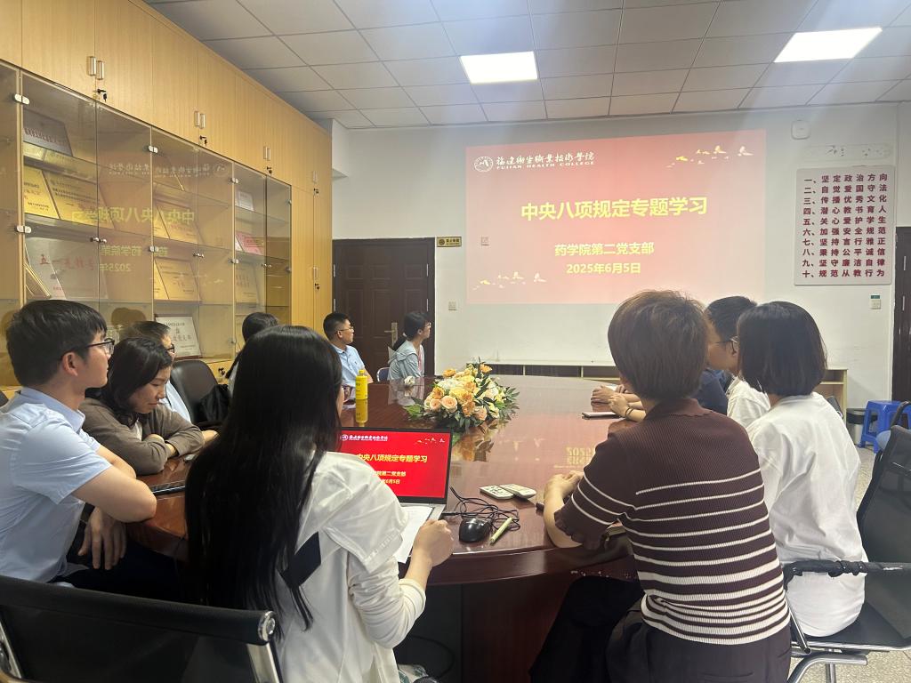 為推動(dòng)黨員深入貫徹中央八項(xiàng)規(guī)定精神學(xué)習(xí)教育,強(qiáng)化紀(jì)律意識(shí)與作風(fēng)建設(shè),6月5日,藥學(xué)院第二黨支部開(kāi)展“理論研讀+現(xiàn)場(chǎng)教學(xué)”雙模式專(zhuān)題活動(dòng)。本次活動(dòng)由黨支部書(shū)記劉丹丹主持,全體教師黨員參加會(huì)議。