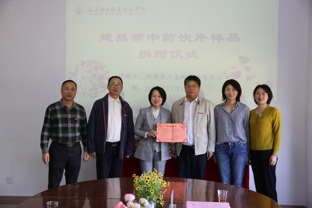 捐贈儀式上,福建承天金嶺藥業(yè)有限公司代表謝瑞華副總經(jīng)理向我校捐贈“建昌幫”中藥炮制標(biāo)本100份,蘇友新校長為謝瑞華副總經(jīng)理頒發(fā)了捐贈證書。