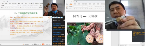 除了專任教師,外聘教師們在中藥教研室教師的協(xié)助下,也都開展了良好的在線教學(xué)。瑞來春堂的梁守渠老師是《中藥商品學(xué)》的任課老師,每次上課時都精心準備了各種中藥材標本,通過直播展示給學(xué)生們看,邊展示邊講授,學(xué)生反應(yīng)很好。