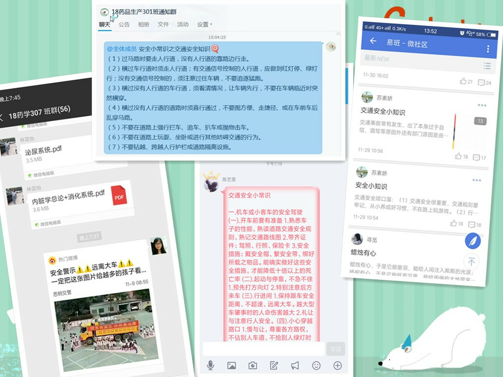 12月2日是第七個“全國交通安全日”,為普及交通安全意識,強化學生交通安全意識,提升學生遵守交通法規(guī)的自覺性,藥學系組織各班級開展“細節(jié)關乎生命,安全文明出行”主題教育活動。 班會上,各班輔導員結合近期學院學生返校途中發(fā)生的交通安全事故以及一些生命安全相關的真實案例,對學生進行安全教育,帶領學生學習交通安全知識,強調做好安全文明出行的每個細節(jié)。此外,還通過班級QQ群、微信群、易班平臺等發(fā)送交通安全小知識。 通過本次主題教育活動,讓學生們掌握了更多的交通安全知識,增強了交通安全意識,提升了交通安全的自我保護能力,大家紛紛表示,會將學到的安全知識用到實際行動中,養(yǎng)成良好的交通習慣, 規(guī)范每一個交通行為,從他律走向自律,做文明交通的參與者。