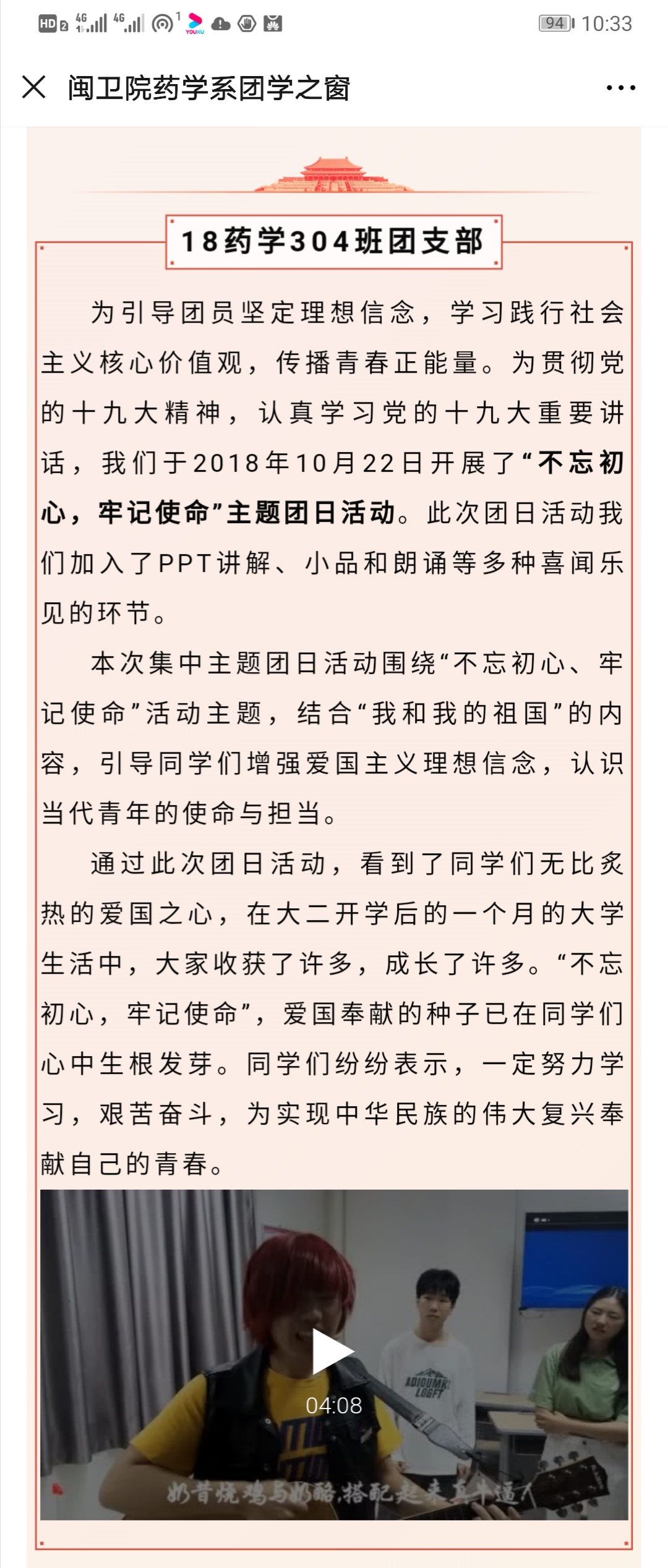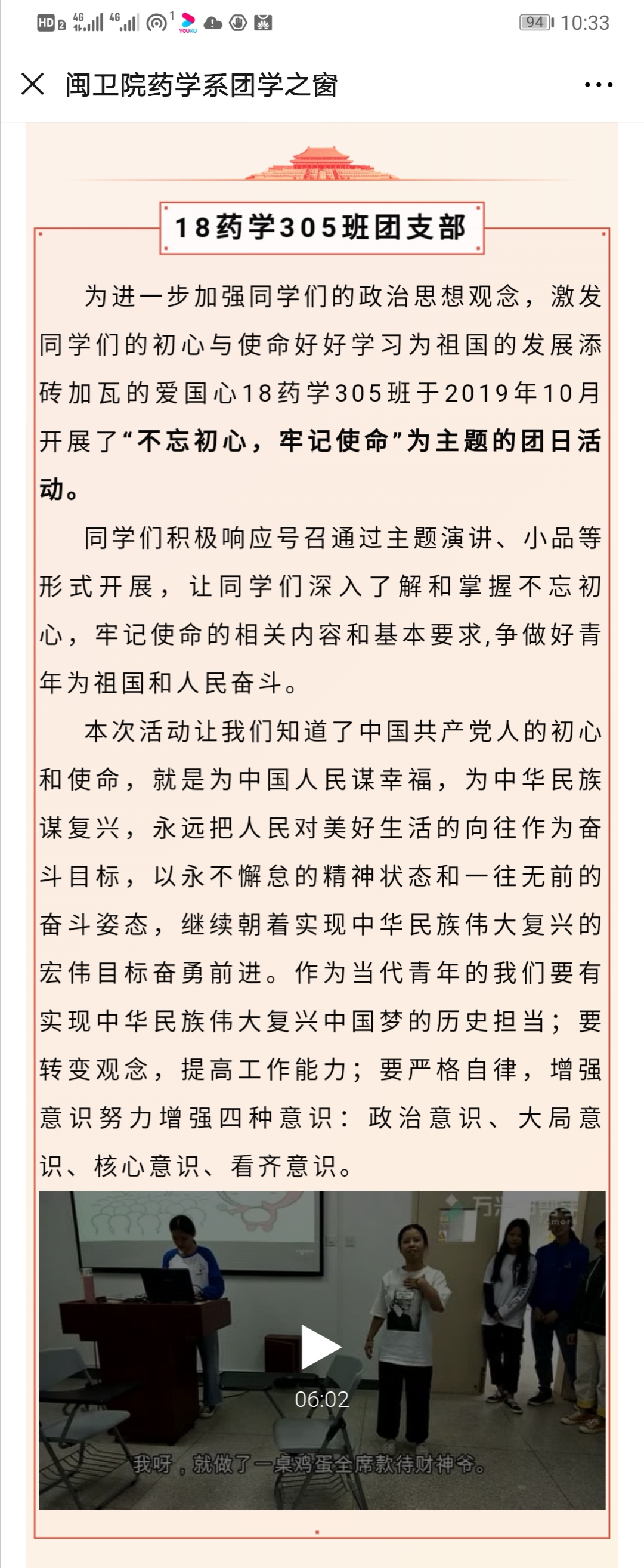 本次活動舉辦旨在選樹典型,形成示范效應(yīng) ,我系一共26個團支部參與,參與率達(dá)到100%。各團支部圍繞活動主題,分別以唱歌、朗讀、知識競賽、情景劇、戶外拓展等多種形式展開。依托微信公眾號平臺,在平臺上發(fā)起宣傳和投票,為期兩天的網(wǎng)絡(luò)投票,票數(shù)達(dá)2741票,閱讀點擊量達(dá)到3255次。最終,19藥學(xué)306班團支部榮獲一等獎和最佳人氣團支部稱號;二等獎由18藥學(xué)304班團支部和18藥學(xué)305班團支部獲得;另外三個團支部分獲三等獎,它們分別是:18藥學(xué)303班團支部、18中藥302班團支部、19藥產(chǎn)302班團支部。