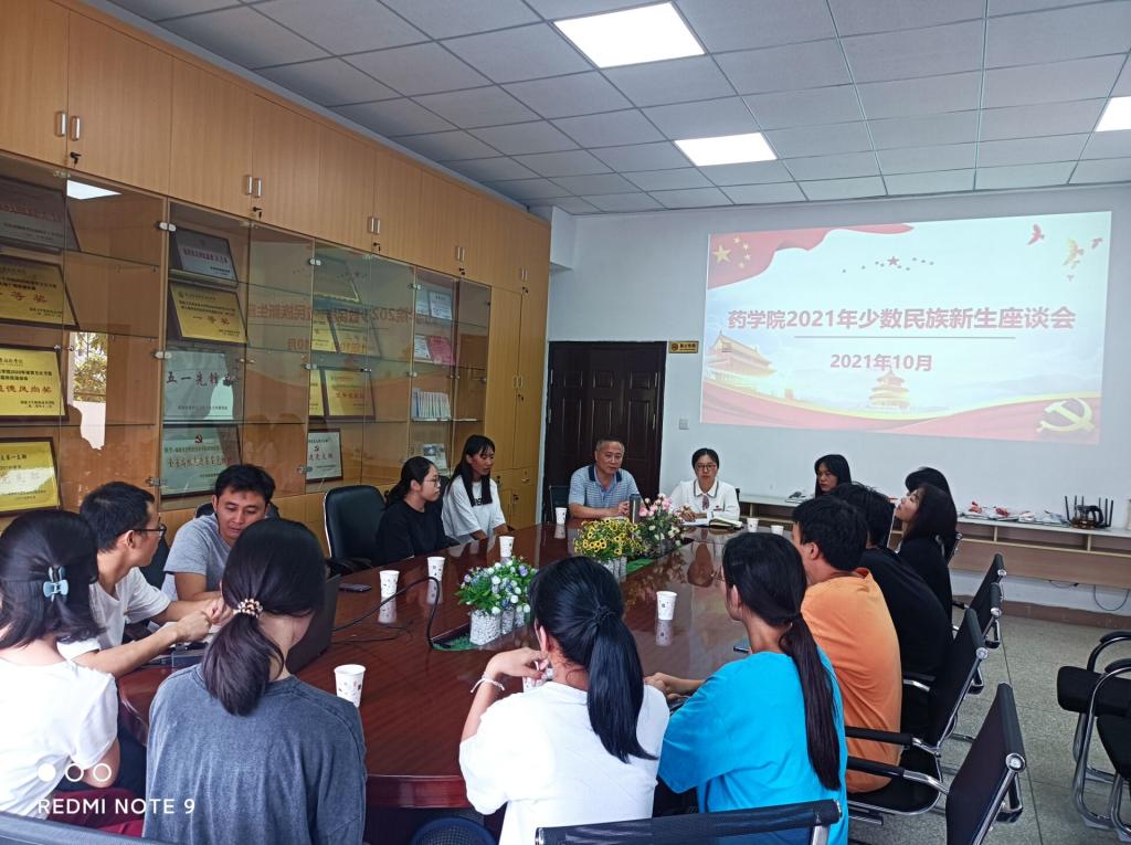 為貫徹落實(shí)《新時(shí)代愛國(guó)主義教育實(shí)施綱要》精神,加強(qiáng)對(duì)學(xué)生的民族團(tuán)結(jié)教育,做好少數(shù)民族學(xué)生的教育管理服務(wù)工作,2021年10月4日下午,藥學(xué)院在207會(huì)議室召開2021年少數(shù)民族新生座談會(huì)。藥學(xué)院黨總支書記鄭力宏、副書記賴文金以及學(xué)生第一、第二、第三黨支部書記出席座談會(huì),11個(gè)少數(shù)民族(瑤族、土家族、白族、畬族、侗族、高山族、布依族、苗族、藏族、回族、壯族)的學(xué)生分別代表我院2021年38位少數(shù)民族新生參加了座談會(huì),學(xué)生第一黨支部書記鄭衛(wèi)敏主持座談會(huì)。