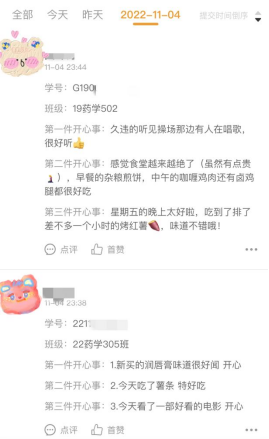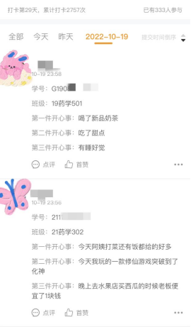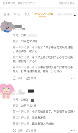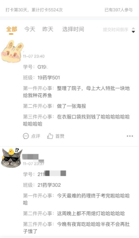 本次,藥學院以每天記錄三件“開心事”21天打卡活動為主推,組織同學們線上打卡“開心事”,引導同學們學會多發(fā)現生活中美好的人和事,以積極向上的心態(tài)面對生活,此次活動吸引力千余名學生參與,累計打卡人次超1.4萬。