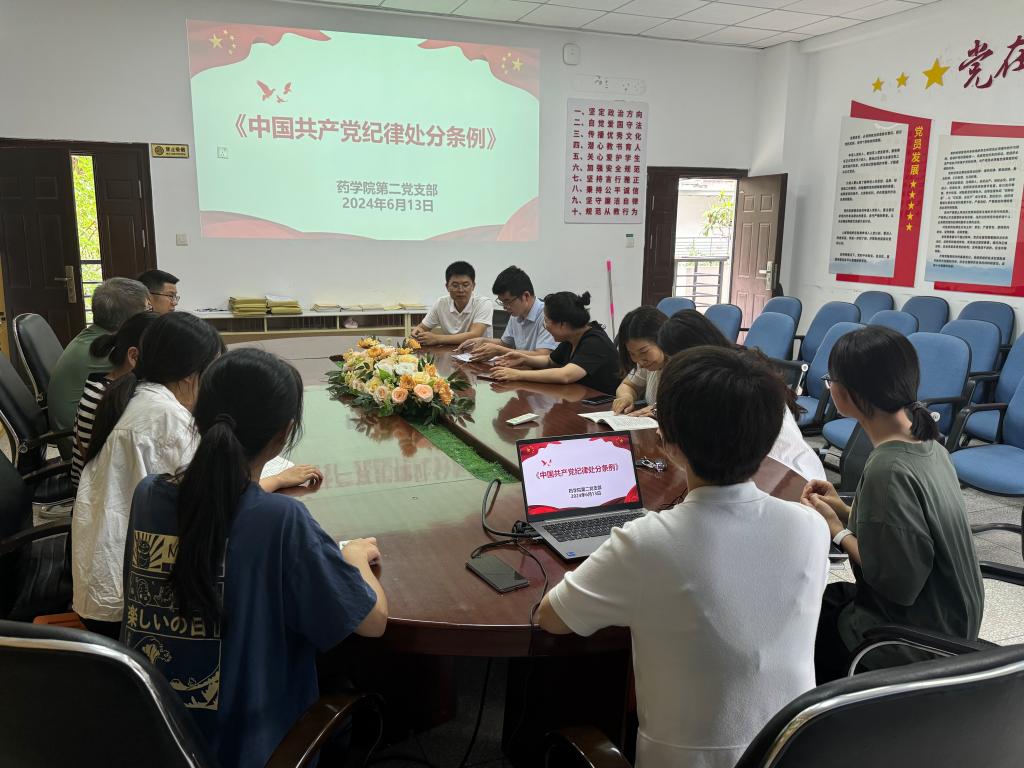 為進一步牢固樹立黨員黨章黨規(guī)黨紀意識,引導全體黨員教師嚴格遵守黨的工作紀律和生活紀律,自覺做到守紀律、講規(guī)矩、知敬畏、存戒懼,6月13日上午,藥學院第二黨支部在藥學院會議室開展《中國共產黨紀律處分條例》(以下簡稱《條例》)的專題學習會。本次會議由黨支部書記劉丹丹主持,全體教師黨員積極參與。