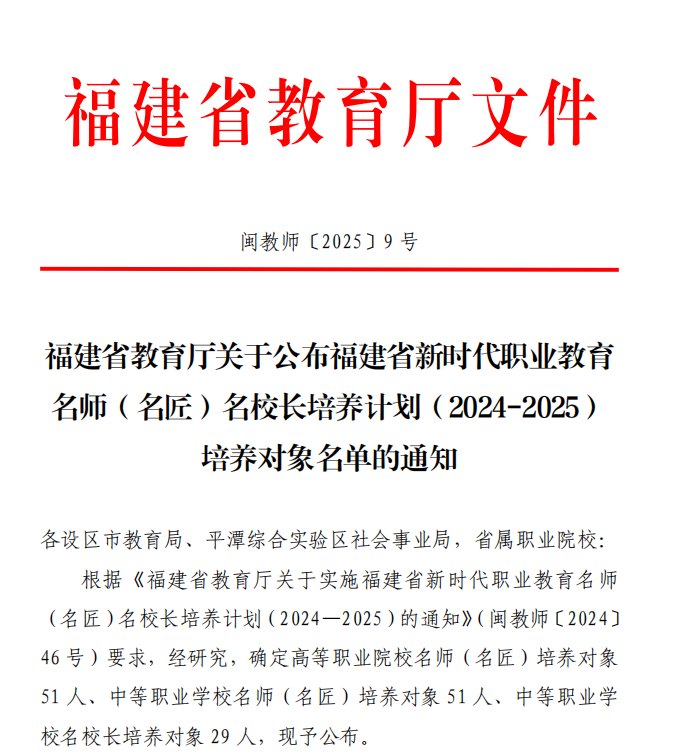 近日,福建省教育廳公布《新時代職業(yè)教育名師(名匠)名校長培養(yǎng)計(jì)劃(2024-2025)培養(yǎng)對象名單》,我校龔海蓉、李泳寧兩位教師成功入選福建省新時代職業(yè)教育高職名師培養(yǎng)對象。
