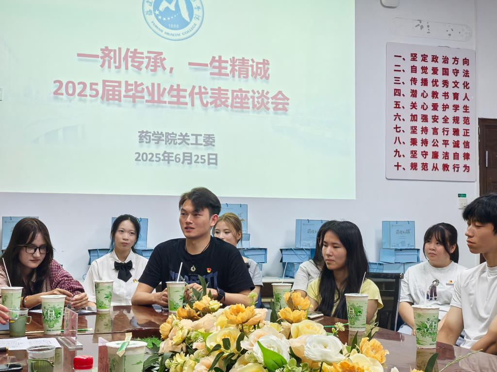 蟬鳴聲中又到畢業(yè)季,驪歌輕唱啟風(fēng)帆。 2025年6月25日上午,藥學(xué)院會(huì)議室內(nèi)茶香裊裊,流淌著畢業(yè)季特有的眷戀與希冀。藥學(xué)院關(guān)工委邀請(qǐng)退休老同志歐春木、鄭力宏、肖健到校,與來(lái)自不同專(zhuān)業(yè)、不同民族、涵蓋多種發(fā)展路徑的24名畢業(yè)生代表圍坐一堂,共同參加一場(chǎng)啟航座談會(huì)。
