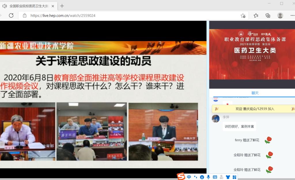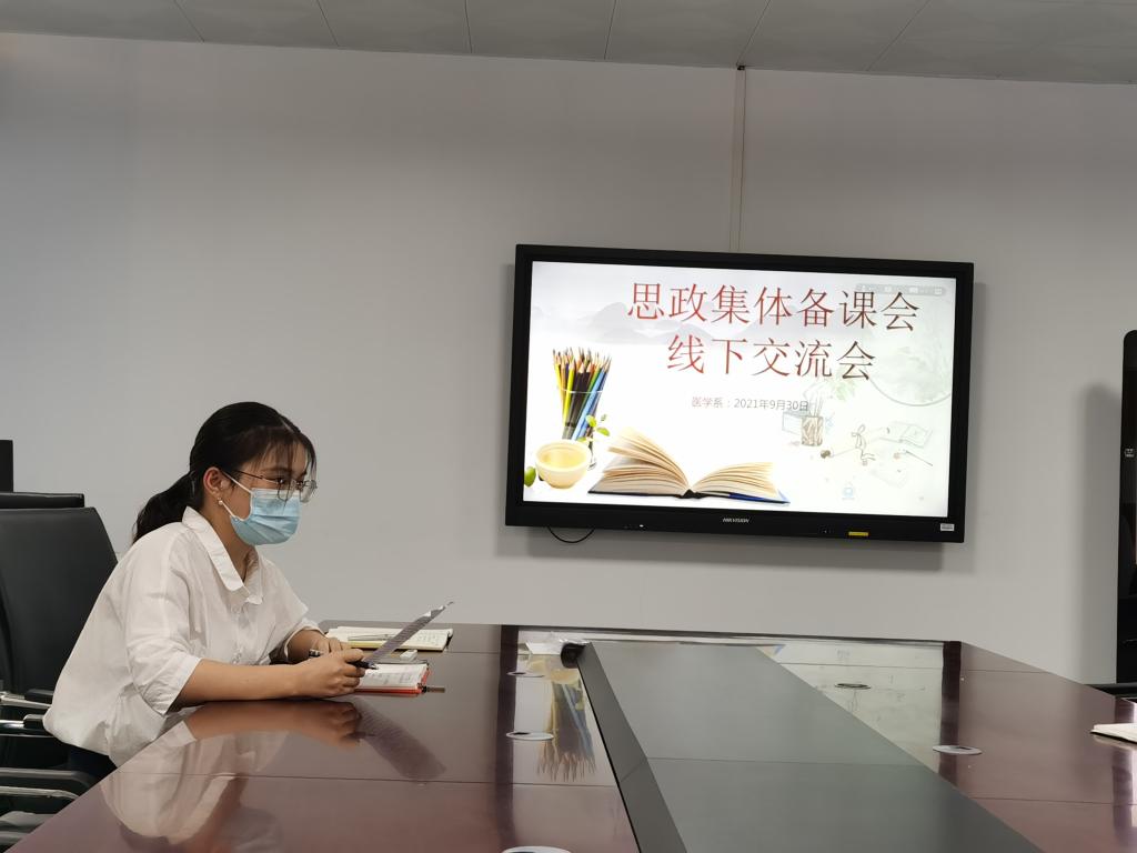 為強(qiáng)化課程思政建設(shè),將課程思政貫穿教育教學(xué)全過程,著力培養(yǎng)學(xué)生“敬佑生命、救死扶傷、甘于奉獻(xiàn)、大愛無疆”的醫(yī)者精神,實(shí)現(xiàn)課程育人目標(biāo),落實(shí)立德樹人根本任務(wù)。2021 年 9 月 25 日至26 日,醫(yī)學(xué)系組織教師在線觀看《全國職業(yè)院校醫(yī)藥衛(wèi)生專業(yè)大類課程思政集體備課》,并于9月30日在實(shí)訓(xùn)樓311會(huì)議室圍繞醫(yī)藥衛(wèi)生專業(yè)大類課程思政示范課程建設(shè)開展交流研討。