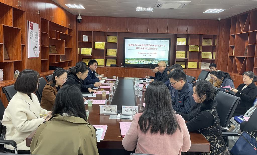 為深入學習貫徹黨的二十大精神,開展“深學爭優(yōu)、敢為爭先、實干爭效”行動,進一步加強人才培養(yǎng)、專業(yè)建設、學科發(fā)展、課程建設等方面的交流合作,2023年3月28日,福建醫(yī)科大學基礎醫(yī)學院黨委書記郭松斌、院長陳婉南一行6人來校走訪交流并開展訪企拓崗促就業(yè)活動。教務處負責人李淼淼、醫(yī)學院黨政領導班子、臨床醫(yī)學專業(yè)帶頭人及專業(yè)教師、基礎醫(yī)學相關教研室主任及專業(yè)教師代表參加交流會議,會議由醫(yī)學院黨總支書記邱滾忠主持。