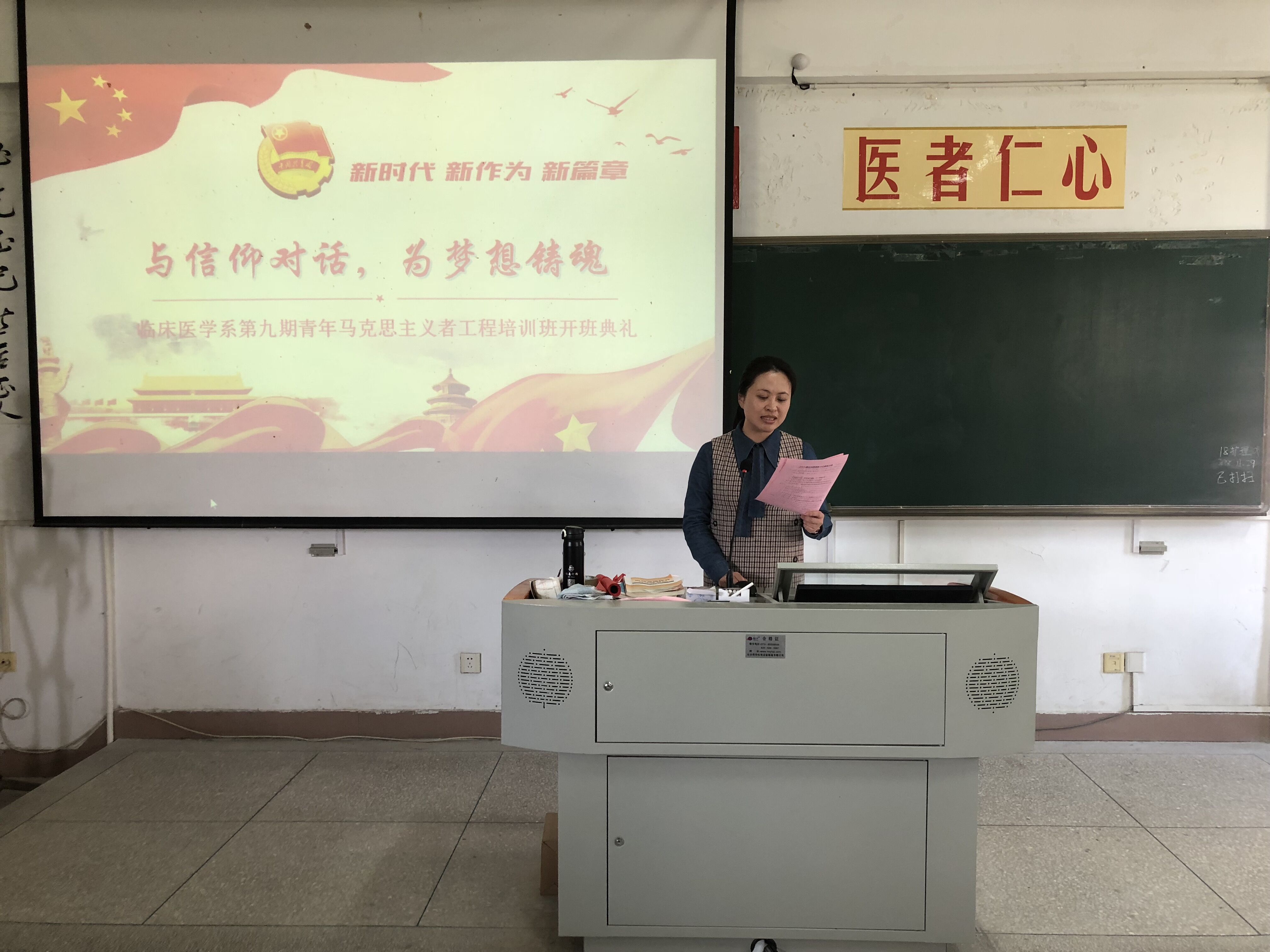 開(kāi)班典禮由團(tuán)總支副書(shū)記王繼鑒同學(xué)的主持,在莊嚴(yán)的國(guó)歌聲中儀式正式開(kāi)始。首先,由團(tuán)總支副書(shū)記謝林輝老師為本次開(kāi)班儀式宣讀學(xué)員名單。學(xué)員代表王焱同學(xué)接著上臺(tái)表明未來(lái)的學(xué)習(xí)中要用實(shí)際行動(dòng)的決心并具體提出青馬學(xué)員們應(yīng)在課程中完成的相應(yīng)學(xué)習(xí)任務(wù)。臨床醫(yī)學(xué)系黨總支陳俊穎副書(shū)記上臺(tái)講話并對(duì)學(xué)員們提出了寶貴的建議,一要堅(jiān)定理想信念,擔(dān)當(dāng)歷史使命;二要貫穿思想教育,堅(jiān)持理論與實(shí)踐相結(jié)合;三要汲取醫(yī)學(xué)知識(shí),塑造良好品格,放飛青春夢(mèng)想。開(kāi)班儀式在國(guó)際歌中落下帷幕。