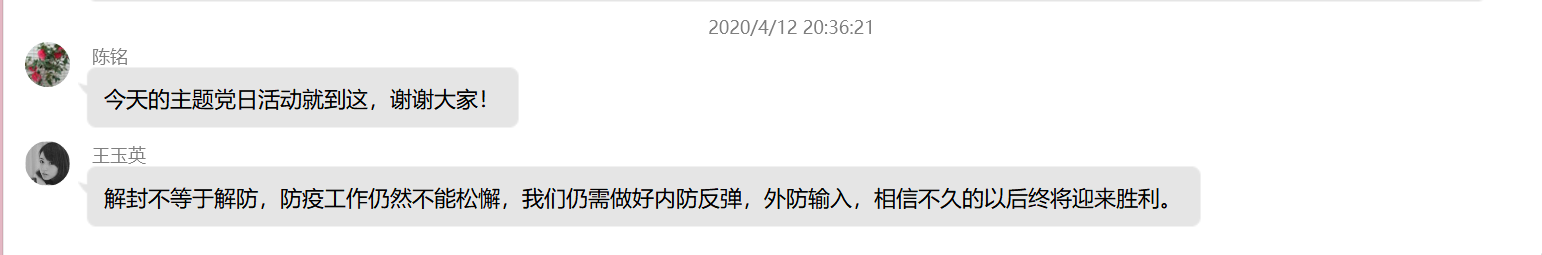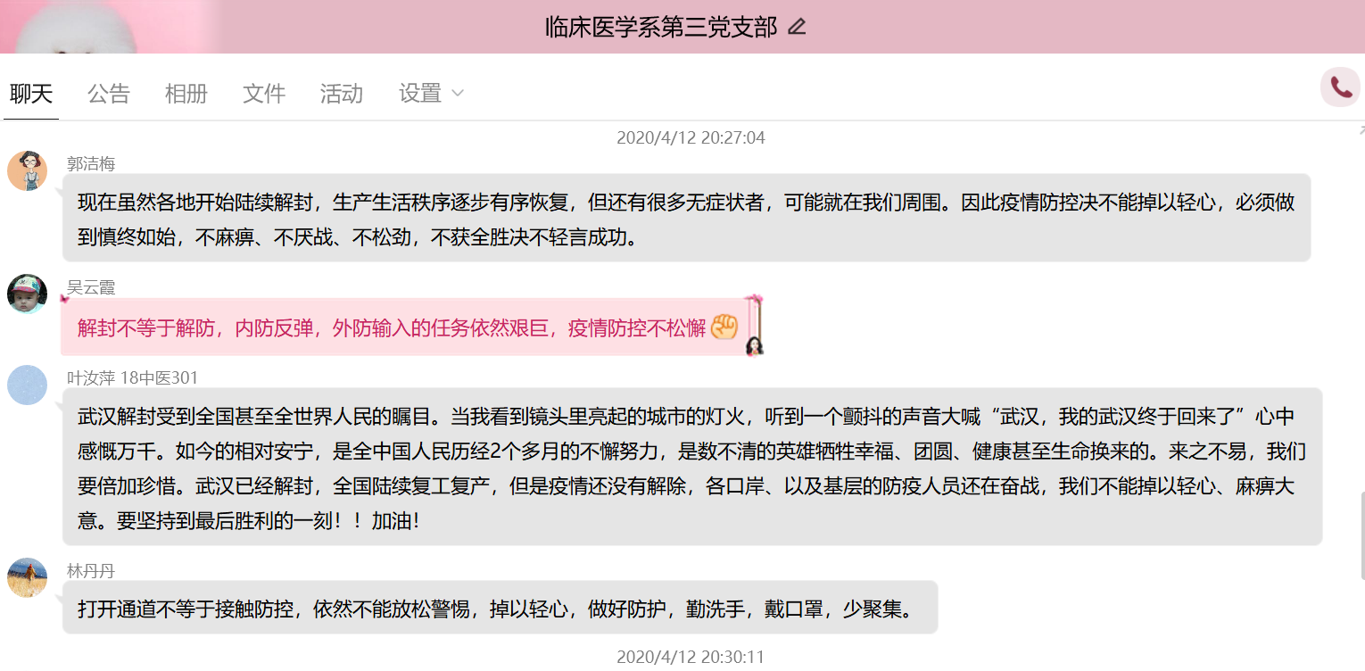 為更好地組織支部黨員學(xué)習(xí),發(fā)揮黨員的先鋒模范作用。4月12日晚上,臨床醫(yī)學(xué)系第三黨支部開(kāi)展學(xué)習(xí)《武漢戰(zhàn)“疫”日歷》、《慎終如始 防控不松——寫(xiě)在武漢市解除離漢通道管控之際》、《打開(kāi)通道不等于解除防控》等相關(guān)新聞報(bào)道的主題黨日活動(dòng),此次活動(dòng)由支部書(shū)記陳銘同志主持,支部全體黨員及預(yù)備黨員均參加。