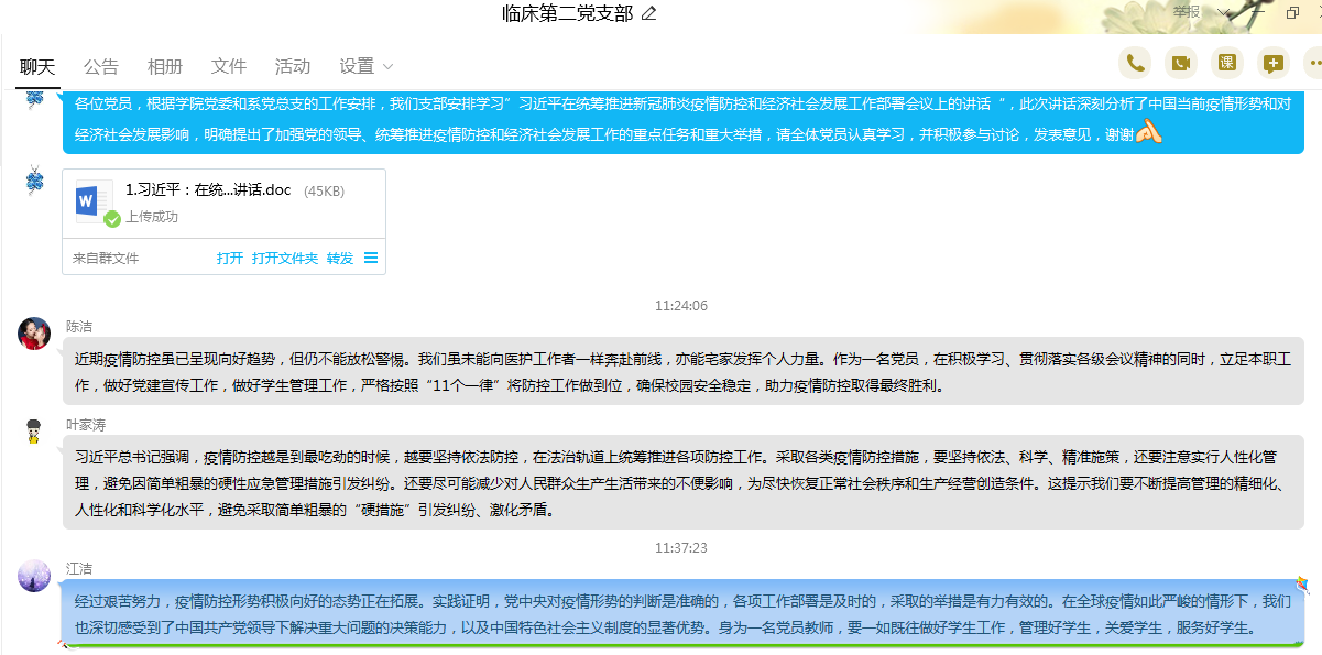 根據(jù)學(xué)院黨委和系黨總支的工作安排,3月8日,臨床醫(yī)學(xué)系第二黨支部全體黨員同志認(rèn)真學(xué)習(xí)了“習(xí)近平:在統(tǒng)籌推進(jìn)新冠肺炎疫情防控和經(jīng)濟(jì)社會發(fā)展工作部署會議上的講話”,習(xí)近平總書記重要講話深刻分析了中國當(dāng)前疫情形勢和對經(jīng)濟(jì)社會發(fā)展影響,明確提出了加強(qiáng)黨的領(lǐng)導(dǎo)、統(tǒng)籌推進(jìn)疫情防控和經(jīng)濟(jì)社會發(fā)展工作的重點(diǎn)任務(wù)和重大舉措,鼓舞人心,提振士氣。