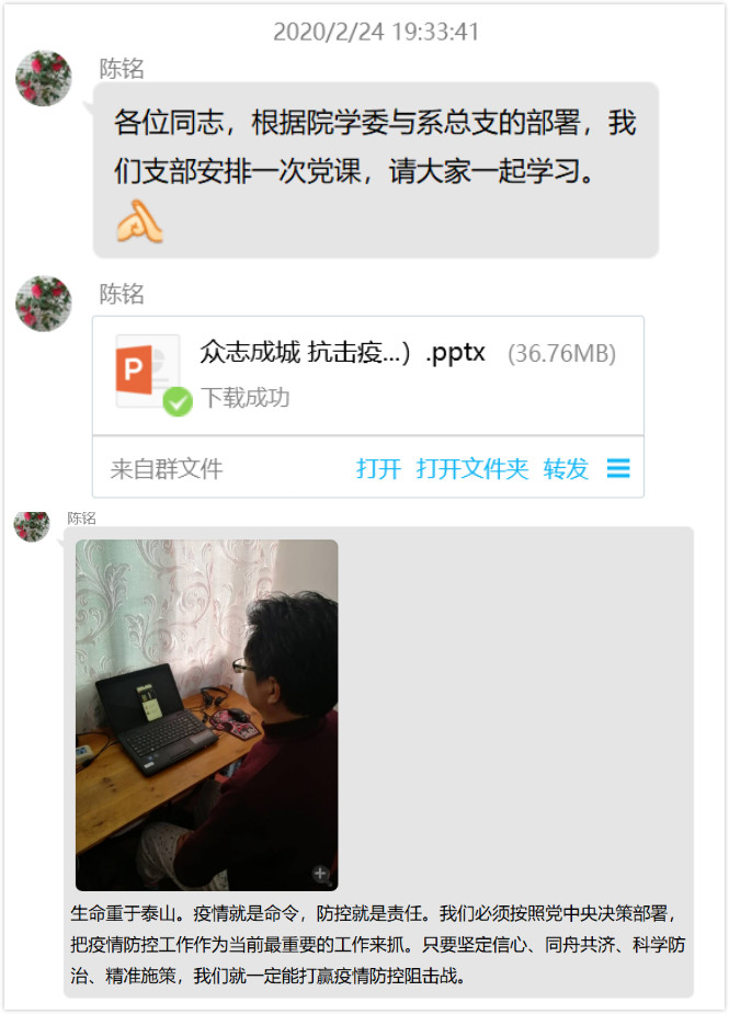 陳銘書記主要從“學(xué)習(xí)解讀習(xí)近平總書記重要講話、十八條防控具體措施、發(fā)揮黨員先鋒模范帶頭作用”三個(gè)方面展開。從對習(xí)近平總書記重要講話的解讀,我們更深刻地認(rèn)識到疫情就是命令,防控就是責(zé)任。在黨中央集中統(tǒng)一領(lǐng)導(dǎo)下,堅(jiān)定信心、同舟共濟(jì)、科學(xué)防治、精準(zhǔn)施策,就一定能打贏疫情防控阻擊戰(zhàn);從健全防控機(jī)制、強(qiáng)化聯(lián)防聯(lián)控、嚴(yán)防疫情傳播、實(shí)施交通檢疫等十八條防控具體措施中,我們看到的是一條條落到實(shí)處的防疫措施,更是一座座堅(jiān)實(shí)的防疫堡壘;從對焦裕祿等優(yōu)秀共產(chǎn)黨員先進(jìn)事跡的學(xué)習(xí),讓我們更堅(jiān)定了要立足本職工作,發(fā)揮黨員先鋒模范帶頭作用。