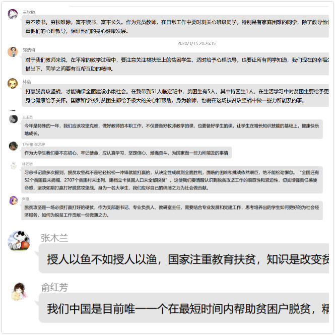在脫貧攻堅(jiān)收官之年突遇新冠肺炎疫情影響,給脫貧攻堅(jiān)各項(xiàng)工作任務(wù)帶來(lái)了挑戰(zhàn)。這次會(huì)議對(duì)全面完成脫貧攻堅(jiān)任務(wù)、堅(jiān)決打贏脫貧攻堅(jiān)戰(zhàn)指明了方向。學(xué)習(xí)完畢,與會(huì)同志們紛紛表示,要堅(jiān)定信念,相信在黨中央的決策部署下,在扶貧干部和全國(guó)人民的共同努力下,我們一定可以?shī)Z取疫情防控和脫貧攻堅(jiān)兩場(chǎng)決戰(zhàn)的全面勝利。黨員教師們還從實(shí)際出發(fā),提出不僅要更加關(guān)注貧困學(xué)生,及時(shí)給予他們心理疏導(dǎo),而且要從專(zhuān)業(yè)角度為學(xué)生謀求更好的職業(yè)發(fā)展,為社會(huì)經(jīng)濟(jì)服務(wù),為脫貧攻堅(jiān)戰(zhàn)貢獻(xiàn)一份力量。學(xué)生預(yù)備黨員也表示,要更加關(guān)心、幫助身邊的貧困同學(xué),做一些力所能及的事情,為脫貧攻堅(jiān)工作盡自己的綿薄之力。
