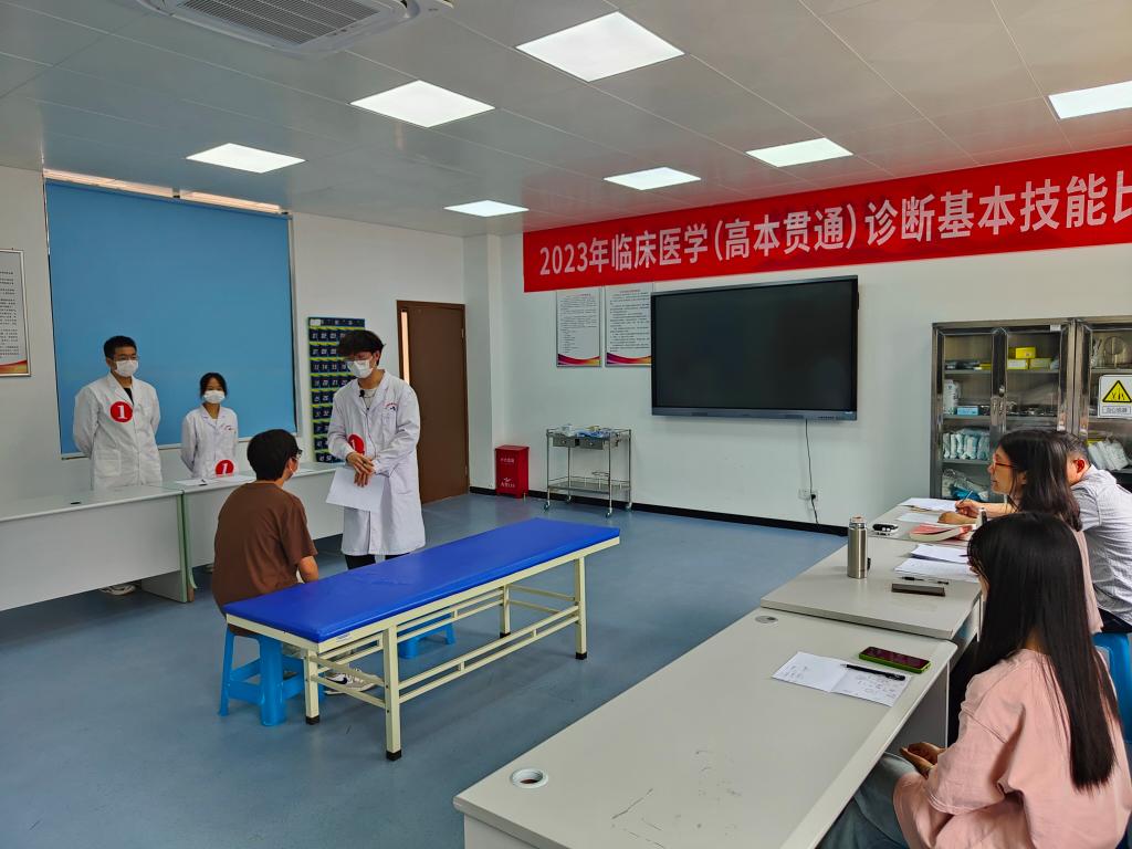 為全面貫徹落實(shí)黨的二十大精神,進(jìn)一步推動(dòng)臨床醫(yī)學(xué)實(shí)踐教學(xué)改革,創(chuàng)新實(shí)踐教學(xué)體系,加強(qiáng)醫(yī)學(xué)生臨床思維、技能操作能力、人文關(guān)懷精神的培養(yǎng),提升醫(yī)學(xué)生科技創(chuàng)新能力、實(shí)踐能力和團(tuán)隊(duì)合作意識(shí),5月20日,由醫(yī)學(xué)院教師第一黨支部、醫(yī)學(xué)院團(tuán)總支、臨床醫(yī)學(xué)專業(yè)舉辦的“臨床醫(yī)學(xué)(高本貫通)診斷基本技能比賽”正式拉開帷幕。大賽前期經(jīng)過初賽角逐,共12名學(xué)生4支隊(duì)伍進(jìn)入決賽。比賽包括個(gè)人賽和團(tuán)體賽兩個(gè)賽項(xiàng),個(gè)人賽項(xiàng)目為體格檢查,團(tuán)體賽包括病史采集、體格檢查及病例分析三個(gè)項(xiàng)目。