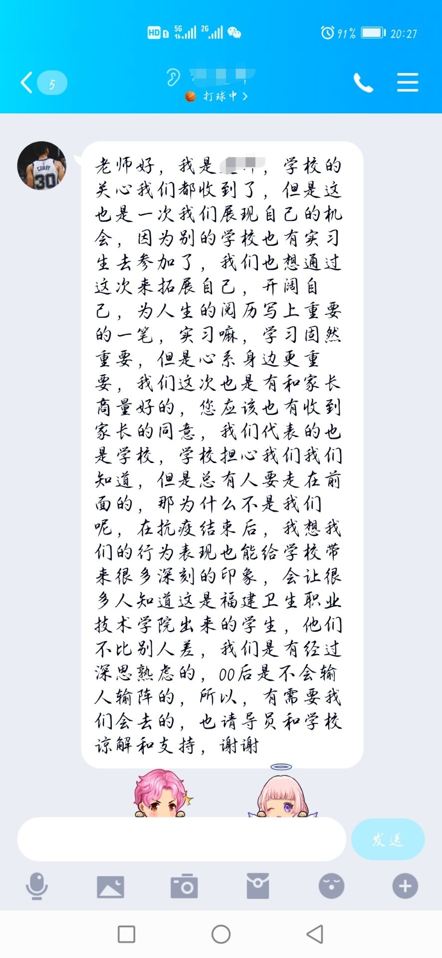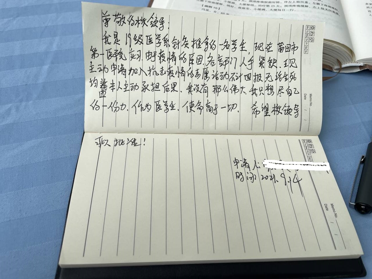 “老師,您好!我是19針推301班陳子萌的家長,我同意孩子支援一線抗疫情……”