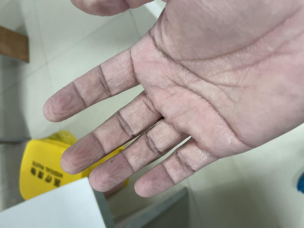 此時此刻的他們,儼然已經(jīng)從懵懂少年蛻變成能獨當(dāng)一面的戰(zhàn)士,雖然還只是實習(xí)生,但這場戰(zhàn)役對他們的考驗并沒有因此而降低標(biāo)準(zhǔn),一套防護服一穿就是七八個小時,期間不能喝水,甚至不能上廁所。脫下手套和防護服的一瞬間,我們見到的那一雙雙被汗水浸濕褶皺的手,那是令人敬仰的雙手。