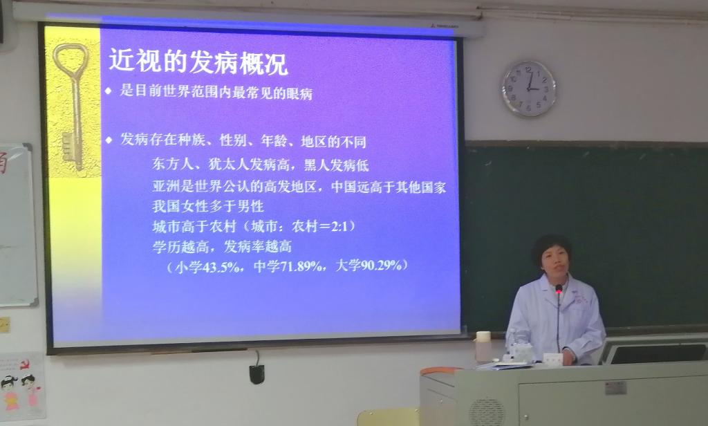 胡艷紅教授通過(guò)全球青少年近視的具體數(shù)據(jù)作為切入點(diǎn),對(duì)有關(guān)于近視的“分類(lèi)、疾病、預(yù)防、治療”四個(gè)方面進(jìn)行詳細(xì)分析。同時(shí)還向同學(xué)們傳授如何分辨真假近視和有效避免近視程度加深的方法,重點(diǎn)提醒了關(guān)于高度近視的危害與治療方法。胡教授用通俗易懂的語(yǔ)言給同學(xué)們帶來(lái)有關(guān)于近視方面的深度知識(shí)與治療方法。她利用數(shù)據(jù),聯(lián)系實(shí)際,以醫(yī)為學(xué)博得了同學(xué)們的熱烈掌聲。