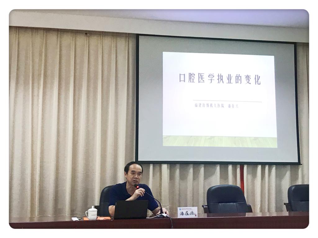 10月15日下午,應(yīng)臨床醫(yī)學(xué)系邀請(qǐng),附屬醫(yī)院福建省級(jí)機(jī)關(guān)醫(yī)院副院長(zhǎng)潘在興到校做《口腔醫(yī)學(xué)執(zhí)業(yè)的變化》專題講座。教務(wù)處處長(zhǎng)朱扶蓉,臨床醫(yī)學(xué)系主任郭禮堅(jiān)、黨總支副書記邱滾忠、副主任林浩、口腔教研室教師以及2020級(jí)口腔醫(yī)學(xué)專業(yè)新生到場(chǎng)聆聽了報(bào)告。