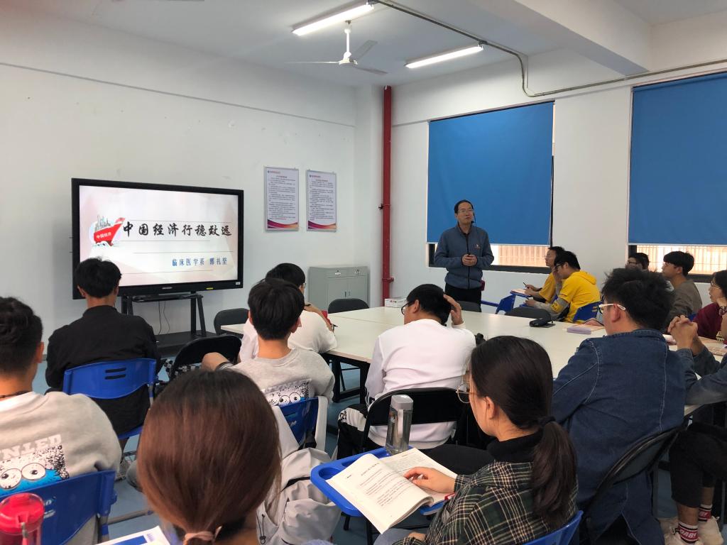 形勢(shì)政策課以《中國經(jīng)濟(jì)行穩(wěn)致遠(yuǎn)》為題,分為四個(gè)部分,分別是“總體平穩(wěn),主要預(yù)期目標(biāo)較好完成”、“穩(wěn)中有進(jìn),轉(zhuǎn)型升級(jí)蹄疾步穩(wěn)”、“穩(wěn)中有變,正確看待風(fēng)險(xiǎn)與挑戰(zhàn)”和“長期向好,我國發(fā)展仍處于重要戰(zhàn)略機(jī)遇期”。郭主任用詳實(shí)的數(shù)據(jù)和形象的圖片闡述了中國經(jīng)濟(jì)平穩(wěn)的總體格局和未來的變數(shù)以及遭遇的挑戰(zhàn),中國經(jīng)濟(jì)航船乘風(fēng)破浪行穩(wěn)致遠(yuǎn)。