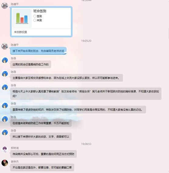 二、學生管理工作組:1、春節(jié)前后提前返閩學生大排查。2、每天定時上報學生異動情況、健康情況。3、通過“我在校園”及時了解學生每日健康,及去向情況。4、召開主題班會分享“防控第一課”觀后感,及校友戰(zhàn)疫故事,強調(diào)防控工作。5、組織團日生活會學習《總書記給在首鋼醫(yī)院實習的西藏大學醫(yī)學院學生親切回信》精神。7、掌握學生思想動態(tài),做好思政教育工作,8、把控學生網(wǎng)絡學習情況,對異常情況及時跟蹤教育。9、了解困難學生情況,積極提供幫助,籌備口罩供應困難學生,收集臨時困難補助申請的材料等。