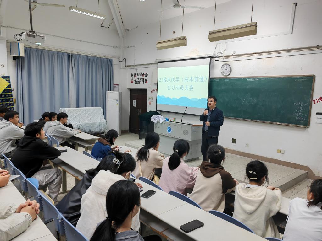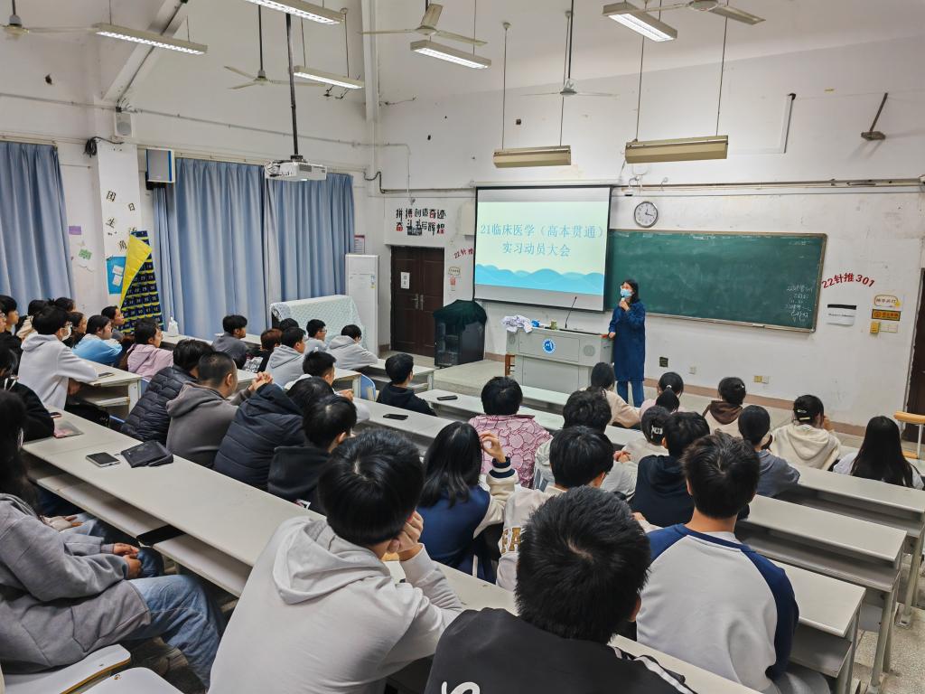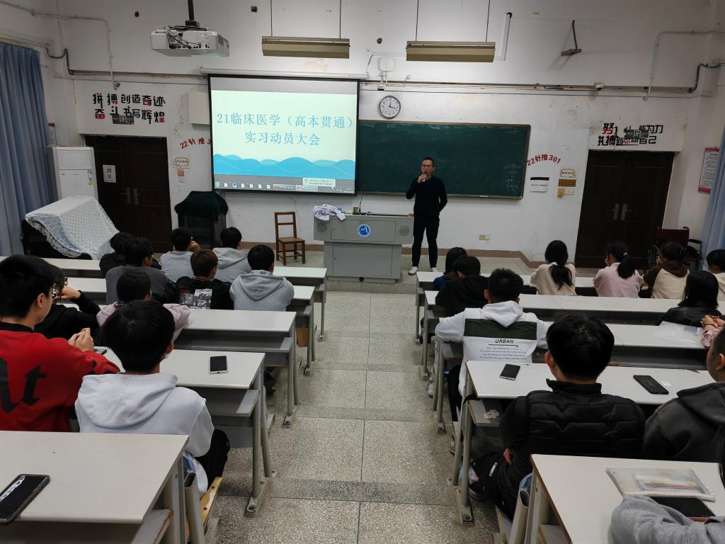2023年11月30日下午,2021級臨床醫(yī)學(高本貫通)專業(yè)學生實習動員在醫(yī)基二階開展,醫(yī)學院黨總支書記傅衍達、副院長(主持工作)鄧元榮、臨床醫(yī)學專業(yè)負責人王芳、輔導員劉明鑫及21級臨床醫(yī)學(高本貫通)專業(yè)共57名學生參加了此次動員大會。