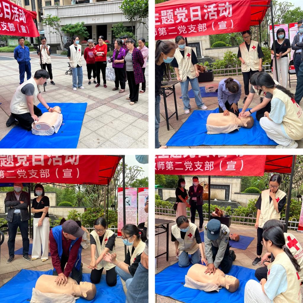 在醫(yī)學(xué)院教師第二黨支部黨員教師的指導(dǎo)下,醫(yī)學(xué)院紅十字會(huì)的同學(xué)們還開(kāi)展了急救知識(shí)宣傳和現(xiàn)場(chǎng)心肺復(fù)蘇術(shù)技能培訓(xùn),吸引了保安師傅、物業(yè)大姐、社區(qū)居民、青少年等各類(lèi)人群前來(lái)參與。
